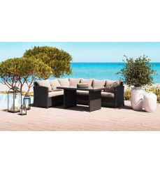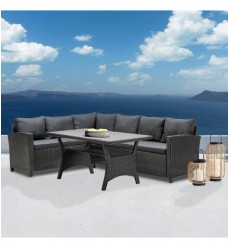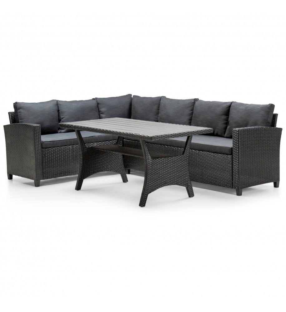 Ratanová sedacia súprava vyrobená na pohodlné sedenie na terase. Skladá sa z rohovej pohovky a stolíka s doskou z dreva Artwood. Elegantný nadčasový štýl ratanového nábytku, odolnosť a jednoduchá údržba zaručujú, že sa z tejto súpravy budete tešiť dlho. Odolný a stabilný voči UV žiareniu - nevybledne.