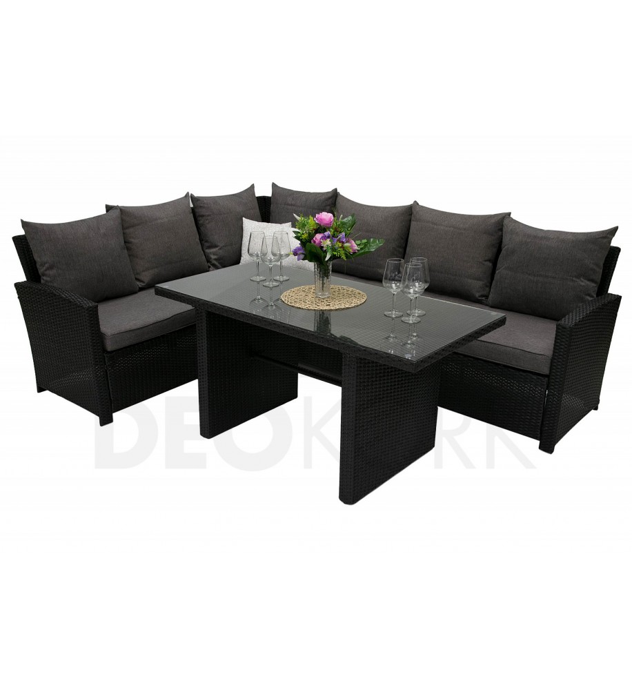 Užite si dlhé letné večery v záhrade. Vďaka veľkému stolu môže pohodlne stolovať celá rodina. Určite uvítate aj mäkkosť kvalitného čalúnenia, ktoré sa ľahko umývaHrúbka vankúšov zaručuje veľké pohodlie pri sedení aj ležaní. Konštrukcia je vyrobená z pevnej ocele ošetrenej proti korózii a ručne pletený umelý ratan je odolný proti vode, snehu, plne bezúdržbový a odolný proti UV žiareniu (nestráca kvalitu ani farbu ani na priamom slnku).