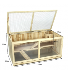 Domček z kvalitného masívneho jedľového dreva pre škrečky a iné malé zvieratá. Výsuvný pozinkovaný plech na jednoduché čistenie. Rozmery: šírka 113 cm, hĺbka 60 cm, výška 57 cm.
