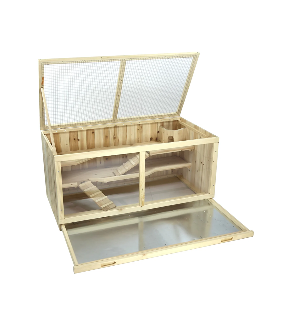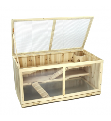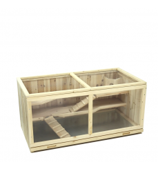 Špecifikácie výrobku: - vyrobené z masívneho neošetreného jedľového dreva - otváracie horné veko pre jednoduché čistenie a prívod čerstvého vzduchu - výsuvná pozinkovaná sieťka pre hygienické čistenie - množstvo krytých plôch, pre pocit bezpečia, tieňa a pokoja - trojposchodová konštrukcia spojená rampami - vhodné pre škrečky a iné malé zvieratá vrátane hlodavcov - predná strana s priehľadným plexisklom