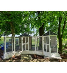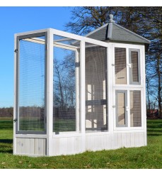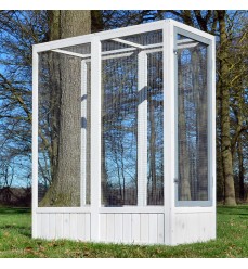 Veľká voliéra s výbehom z kvalitného sušeného jedľového dreva pre papagáje, hlodavce a mačky. Veľmi priestranná. Rozmery: šírka 224 cm, hĺbka 110 cm, výška 183 cm.
