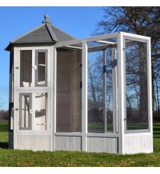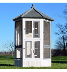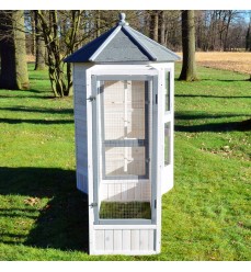 Veľká drevená šesťhranná voliéra pre papagáje, hlodavce a mačky s bočným výbehom z kvalitného vysušeného jedľového dreva. Priestranná s krásnym dizajnom. Táto voliéra skrášli vašu záhradu aj interiér vášho domu. Pre všetky druhy vtákov.
