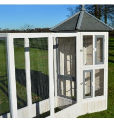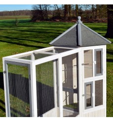 Voliéra je vyrobená z kvalitného jedľového dreva, ktoré je ošetrené ekologickou a nezávadnou lazúrou. Je odolná voči poveternostným vplyvom a navrhnutá na dlhú životnosť. Na streche je kvalitný asfaltový pás proti vode a vlhkosti. Šírka voliéry zaručuje veľkú stabilitu.