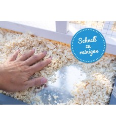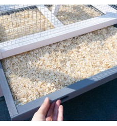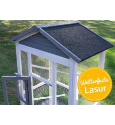 Voliéra je vyrobená z kvalitného vysušeného jedľového dreva, ktoré je ošetrené ekologickou, zdravotne nezávadnou lazúrou. Je odolná voči poveternostným vplyvom a navrhnutá na dlhú životnosť. Na streche je kvalitný asfaltový pás, ktorý chráni pred vodou a vlhkosťou. Súčasťou voliéry sú 3 bidielka, ktoré slúžia ako miesta na sedenie, môžete ich umiestniť do rôznych výšok. Drevený rebrík s piatimi priečkami možno upevniť do rôznych výšok s možnosťou montáže rôznych hračiek. Šírka voliéry zaručuje veľkú stabilitu.