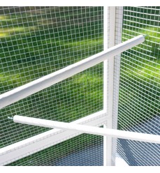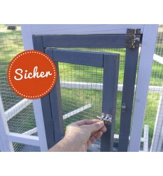 Do voliéry sa dá vstúpiť cez dvoje dvierka. Vnútorný dverný systém (môžete si vybrať, či sa budú otvárať malé alebo veľké dvere). Dvierka sú umiestnené vo vnútri seba a dajú saotvárať samostatne. V spodnej časti voliéry sa nachádza výsuvná kovová zásuvka z pozinkovaného plechu, ktorá zabezpečuje jednoduché a hygienické čistenie. Sieťovina je vysokokvalitná a odolná proti prepichnutiu. Voliéra je vyvýšená na 4 nožičkách, ktoré zabezpečujú cirkuláciu vzduchu. Montáž je jednoduchá, pomocou priloženého obrázkového návodu a skrutiek.