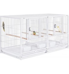 Rozširujúci modul pre dvojitý chov, deliteľná kovová voliéra s čistiacimi nadstavcami a odnímateľnou vnútornou prepážkou. Silný drôt, ktorý nedokážu prehrýzť ani väčšie papagáje. Rozstup mriežok vhodný pre malé papagáje 1 cm. Rozmery: šírka 96 cm, hĺbka 46 cm, výška 53 cm. Farba biela.