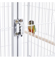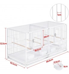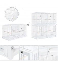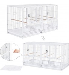 Vysokokvalitná pevná biela chovná voliéra pre vtáky a papagáje s pevným drôtom s dvoma vysúvacími čistiacimi plechmi na lepšiu a hygienickejšiu údržbu. Poskytuje dostatok priestoru pre vašich operených priateľov. Vhodná pre všetky druhy menších papagájov. Klietka má dostatok priestoru na pohyb. Konštrukcia je mimoriadne pevná a stabilná, vyrobená z kvalitného kovu natretého netoxickou bielou farbou s vynikajúcou ochranou proti korózii. Vášmu milovanému papagájovi ponúka skvelý a bezpečný domov. Klietka obsahuje vnútornú deliacu priečku, ktorú možno z vonkajšej strany ľahko vysunúť a odstrániť. Celá klietka sa tak dá spojiť do jednej veľkej klietky.