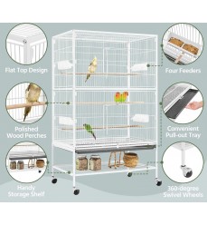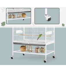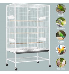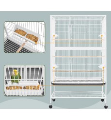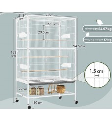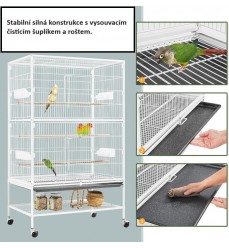 Papagáje a hlodavce môžu v klietke šplhať a lietať, rozstup mriežok je približne 1,5 cm je vhodný pre všetky papagáje. Je vyrobená zo silných drôtov s hrúbkou 3 mm (vertikálne), 4 mm (horizontálne). Voliéra má aj výsuvnú mriežku na spodnej strane nad výsuvnou zásuvkou, ktorá zabraňuje odletu zvierat počas čistenia. Výsuvná zásuvka z tvrdeného plastu zabezpečuje pohodlné a hygienické čistenie. Voliéra stojí na 4 kolieskach s brzdami, vďaka ktorým ju ľahko a rýchlo premiestnite na iné miesto, môžete ju ľubovoľne premiestňovať. Klietka je odolná voči dažďu a slnku. Do voliéry sa vchádza dvomi veľkými posuvnými dverami, vo vnútri sú 3 dlhé drevené bidlá, ktoré môžete umiestniť do rôznych výšok.