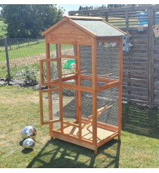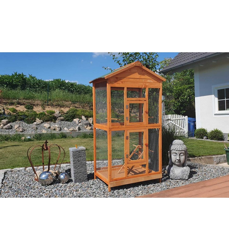 Voliéra je vyrobená z kvalitného vysušeného jedľového dreva, ktoré je ošetrené ekologickou, zdravotne nezávadnou lazúrou. Je odolná voči poveternostným vplyvom a navrhnutá na dlhú životnosť. Na streche je kvalitný asfaltový pás, ktorý chráni pred vodou a vlhkosťou. Súčasťou voliéry sú 3 bidielka, ktoré slúžia ako miesta na sedenie, môžete ich umiestniť do rôznych výšok. Drevený rebrík so štyrmi priečkami možno upevniť do rôznych výšok s možnosťou montáže rôznych hračiek. Šírka voliéry zaručuje veľkú stabilitu.