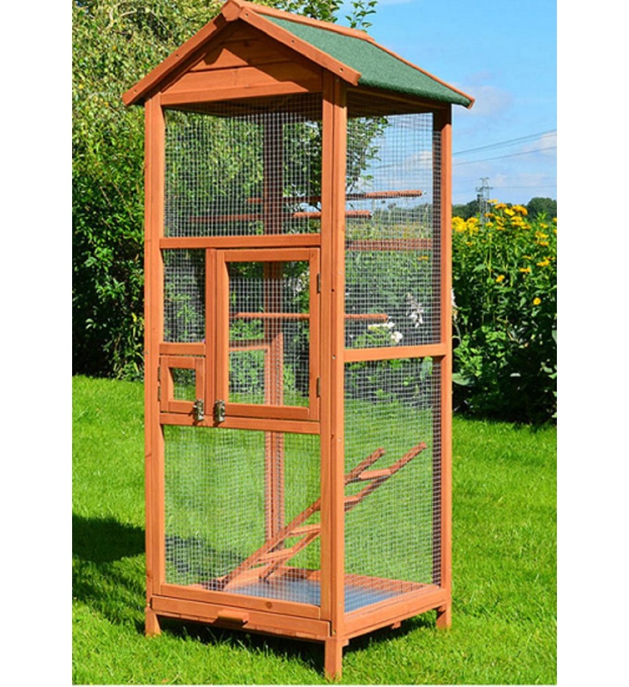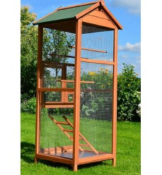 Voliéra je vyrobená z kvalitného vysušeného jedľového dreva, ktoré je ošetrené ekologickou, zdravotne nezávadnou lazúrou. Je odolná voči poveternostným vplyvom a navrhnutá na dlhú životnosť. Na streche je kvalitný asfaltový pás, ktorý chráni pred vodou a vlhkosťou. Súčasťou voliéry sú 3 bidielka, ktoré slúžia ako miesta na sedenie, môžete ich umiestniť do rôznych výšok. Drevený rebrík so štyrmi priečkami možno upevniť do rôznych výšok s možnosťou montáže rôznych hračiek. Šírka voliéry zaručuje dobrú stabilitu.