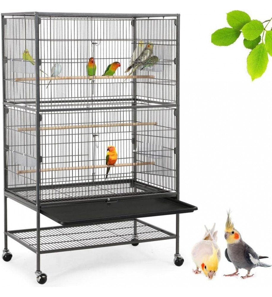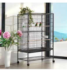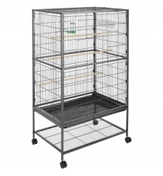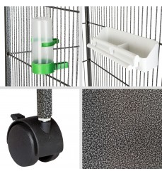 Papagáje a hlodavce môžu v klietke šplhať a lietať, rozstup mriežok je približne 1,5 cm je vhodný pre všetky papagáje. Je vyrobená zo silných drôtov s hrúbkou 3 mm (vertikálne), 4 mm (horizontálne). Voliéra má aj mriežku na spodnej strane nad výsuvnou zásuvkou, ktorá zabraňuje odletu zvierat počas čistenia. Výsuvná zásuvka z tvrdeného plastu zabezpečuje pohodlné a hygienické čistenie. Voliéra stojí na 4 kolieskach, z ktorých dve sú s brzdou, vďaka čomu ju môžete ľahko a rýchlo premiestniť na iné miesto, môžete ju ľubovoľne premiestňovať. Klietka je odolná voči dažďu a slnku. Do voliéry sa vchádza dvomi veľkými posuvnými dverami, vo vnútri sú 3 dlhé drevené bidlá, ktoré môžete umiestniť do rôznych výšok.