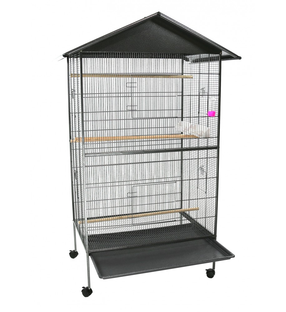 Papagáje a hlodavce môžu v klietke šplhať a lietať, rozstup mriežok je 1 cm, takže je vhodná pre všetky malé aj veľké papagáje. Je vyrobená zo silných drôtov s hrúbkou 2 mm (vertikálne), 4 mm (horizontálne). Voliéra má aj mriežku v spodnej časti nad výsuvnou zásuvkou, ktorá zabraňuje odletu zvierat počas čistenia. Výsuvná zásuvka z tvrdeného plastu zabezpečuje pohodlné a hygienické čistenie. Špeciálne upravená strecha chráni vášho papagája pred poveternostnými vplyvmi. Vďaka tomu zostanú vaši operení priatelia v suchu a pohodlí. Voliéra stojí na 4 kolieskach s brzdami, vďaka ktorým ju môžete ľahko a rýchlo premiestniť na iné miesto, môžete ju ľubovoľne premiestňovať. Klietka je odolná voči dažďu a slnku. Je vhodná do interiéru aj exteriéru.