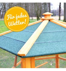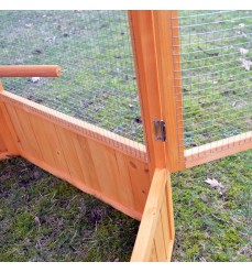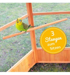 Voliéra je vyrobená z kvalitného jedľového dreva, ktoré je ošetrené ekologickou a nezávadnou lazúrou. Je odolná voči poveternostným vplyvom a navrhnutá na dlhú životnosť. Na streche je kvalitný asfaltový pás proti vode a vlhkosti. Súčasťou voliéry sú 3 bidielka, ktoré slúžia na sedenie, môžete ich umiestniť do rôznych výšok. Šírka voliéry zaručuje veľkú stabilitu.