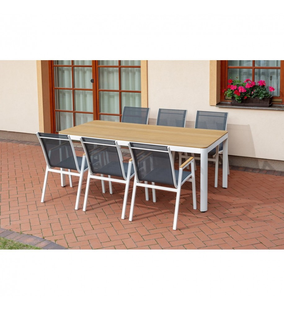 Exkluzívna jedálenská súprava bez kompromisov pre najnáročnejších zákazníkov! Obsahuje záhradný stôl TIMPANA SIENA z vysokokvalitného hliníka z nehrdzavejúcej ocele a hrubú dosku z umeleckého dreva, ktoré je tvrdé ako drevo, ale na rozdiel od dreva ho nenapádajú paraziti, neabsorbuje vodu a je úplne bezúdržbové. Stačí ho teda len utrieť suchou handričkou.