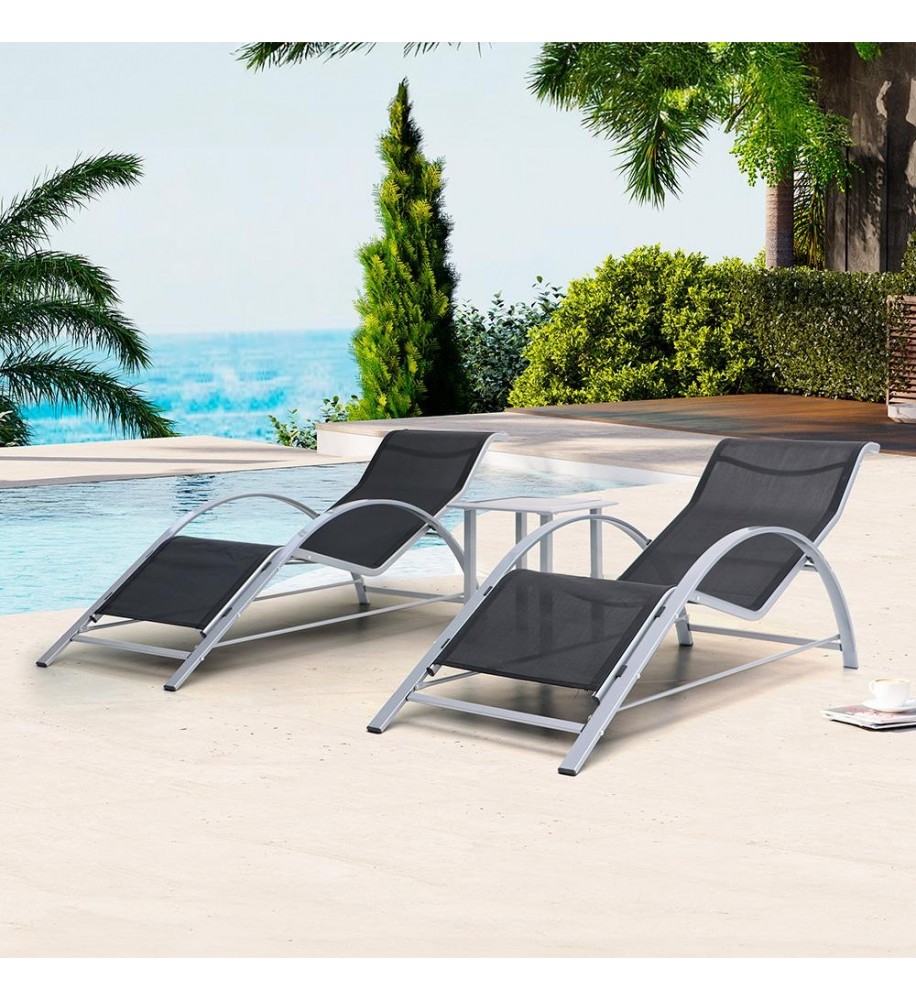 Kvalitná súprava štýlových záhradných stoličiek s textilnou tkaninou so stolom. Súprava dvoch lehátok + stôl, 162x67x60 cm.