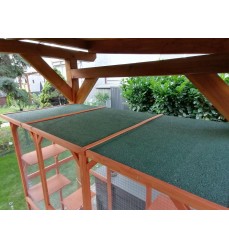 Je vyrobena z kvalitního vysušeného jedlového dřeva, které je ošetřeno ekologickou a nezávadnou lazurou. Je odolná proti povětrnostním vlivům a navržena pro dlouhou životnost. Na střeše je kvalitní asfaltový pás proti vodě a vlhkosti. Voliéra má velká přední dvířka, kterými se můžete dostanete dovnitř. Šířka zaručuje velkou stabilitu. Všechny otevírací a zavírací mechanismy jsou kvalitní kovové.
