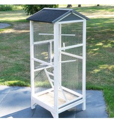 Voliéra je vyrobena z kvalitního vysušeného jedlového dřeva, které je ošetřeno ekologickou, nezávadnou lazurou. Je odolná proti povětrnostním vlivům a navržena pro dlouhou životnost. Na střeše je kvalitní asfaltový pás proti vodě a vlhkosti. Voliéra obsahuje 3 bidýlka, která slouží jako dosedací plochy, můžete je umístit do různých výšek. Dřevěný žebřík se čtyřmi příčkami lze upevnit do různé výšky s možností namontování různých hraček. Šířka voliéry zaručuje dobrou stabilitu.